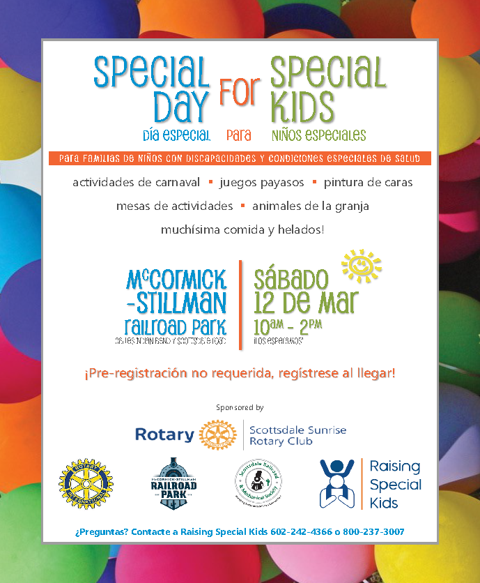 El Scottsdale Sunrise Rotary Club está invitando a las familias de niños con discapacidades o necesidades especiales de atención médica al regreso de su Día especial anual para niños especiales el sábado 12 de marzo de 2022, de 10 a.m. a 2 p.m. en McCormick-Stillman Railroad Park en Scottsdale.