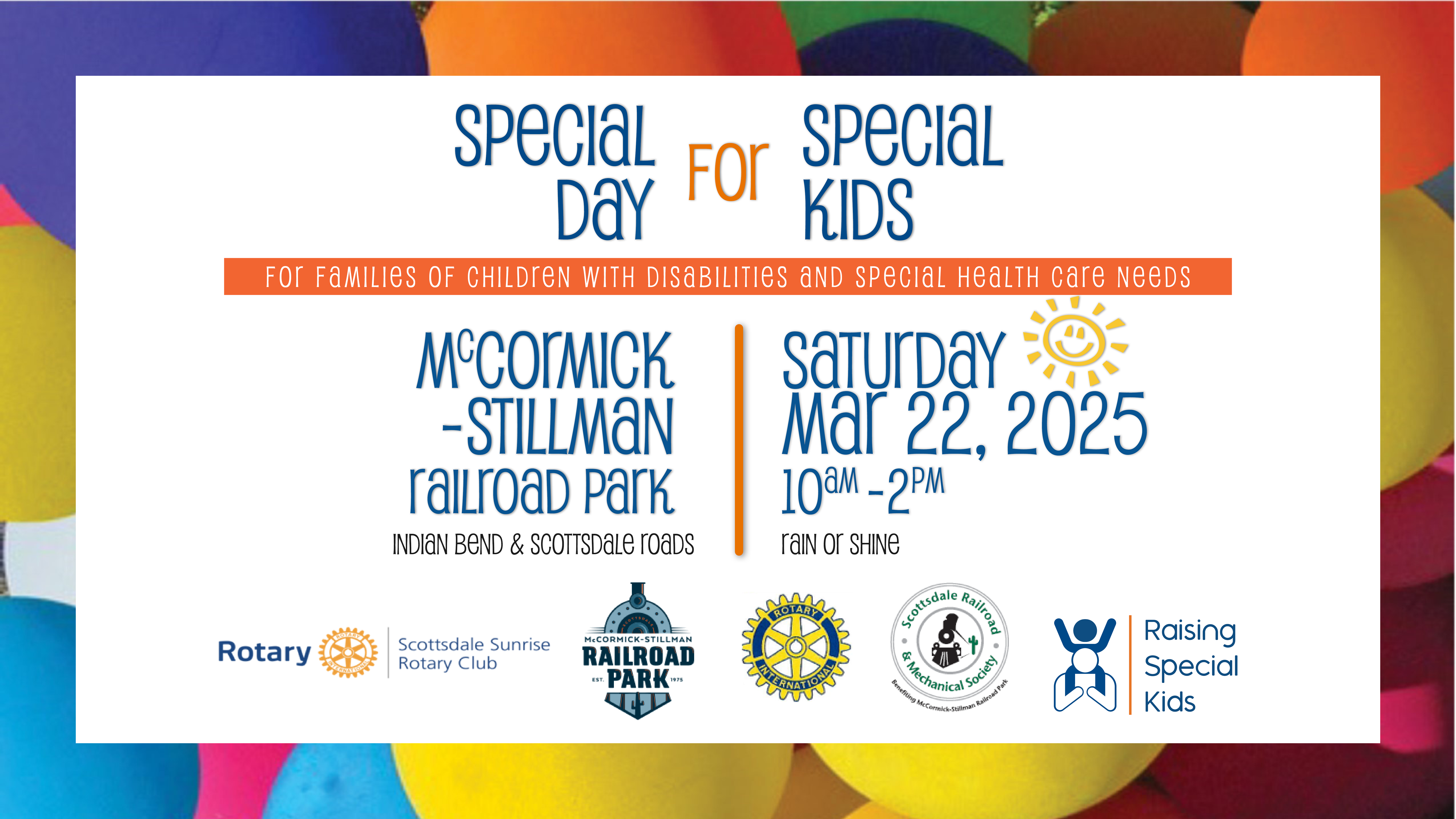 The Scottsdale Sunrise Rotary Club is inviting families of children who have disabilities or special health care needs to the return of its annual Special Day for Special Kids on Saturday, March 22, 2025, from 10 a.m to 2 p.m. at McCormick-Stillman Railroad Park in Scottsdale.